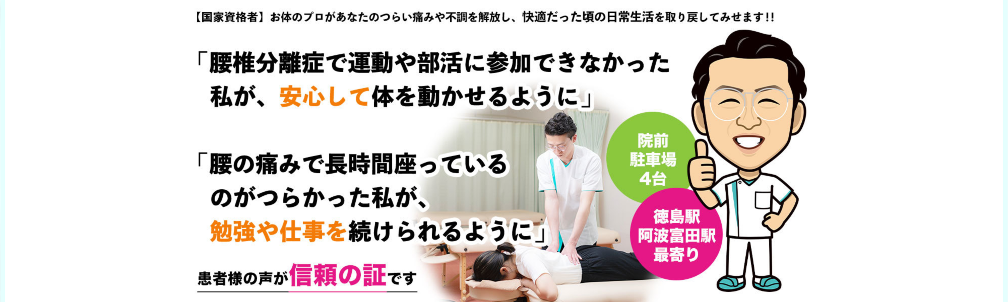 徳島で腰痛・股関節痛・坐骨神経痛・交通事故治療に強い整骨院