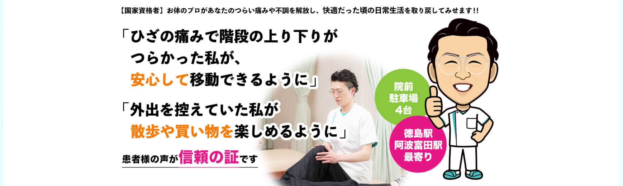 徳島つじ整骨院が、あなたの抱えている不安や疑問点を取り除き、適切な施術を行います!