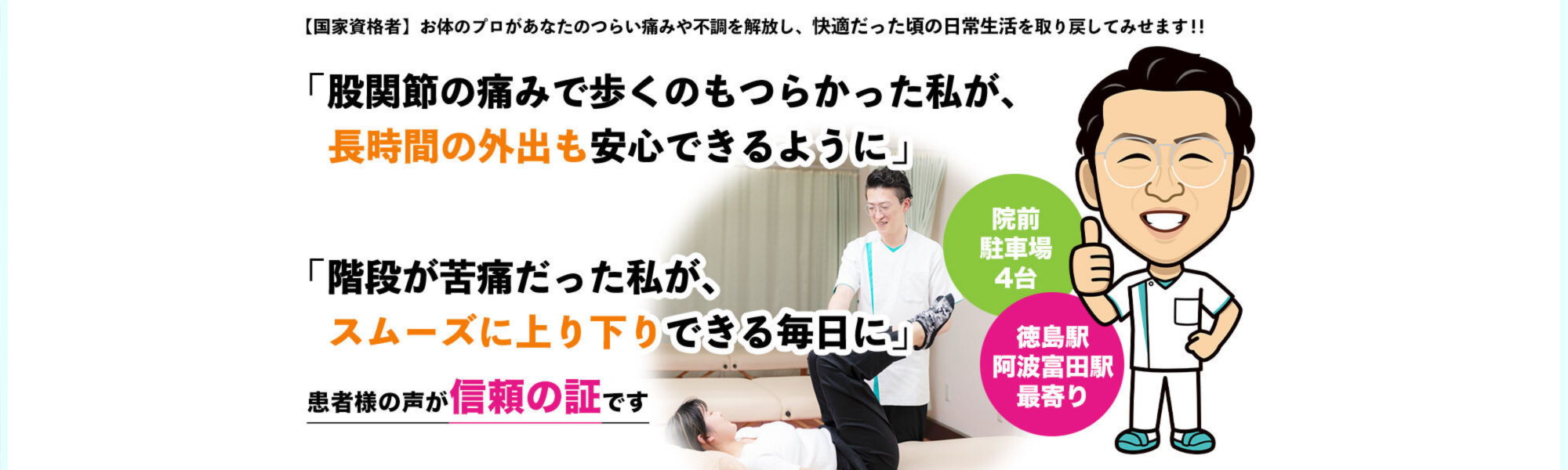 徳島つじ整骨院は、股関節痛・変形性股関節症に特化した整骨院です。