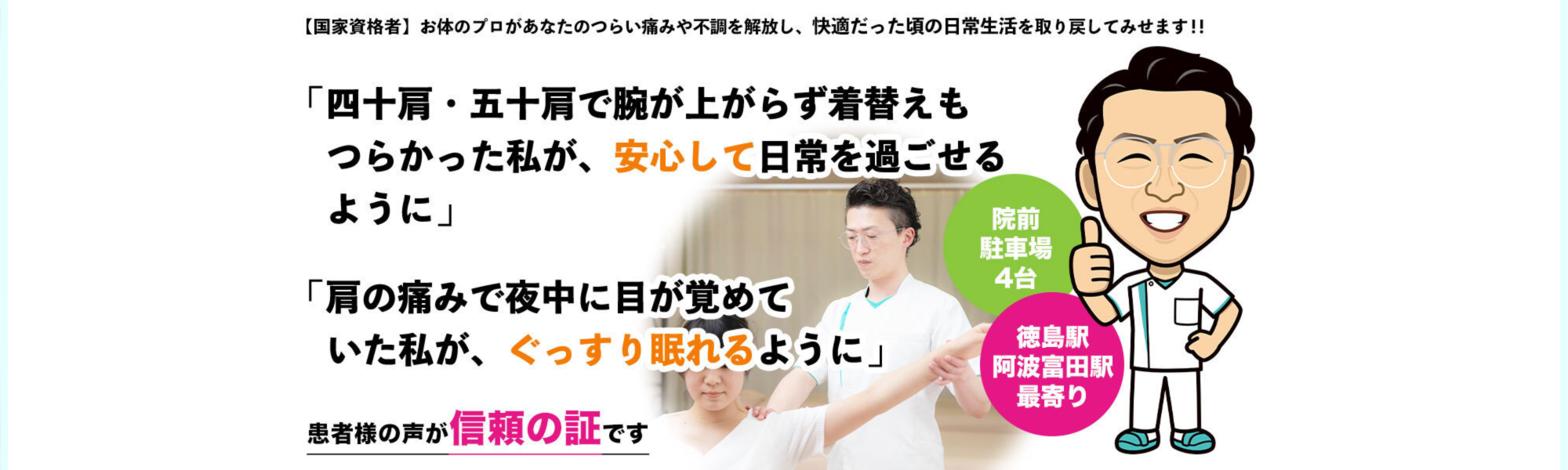 徳島市で整骨・整体なら、徳島駅徒歩15分・阿波富田駅徒歩5分の『つじ整骨院』へ(院前に駐車場5台有)